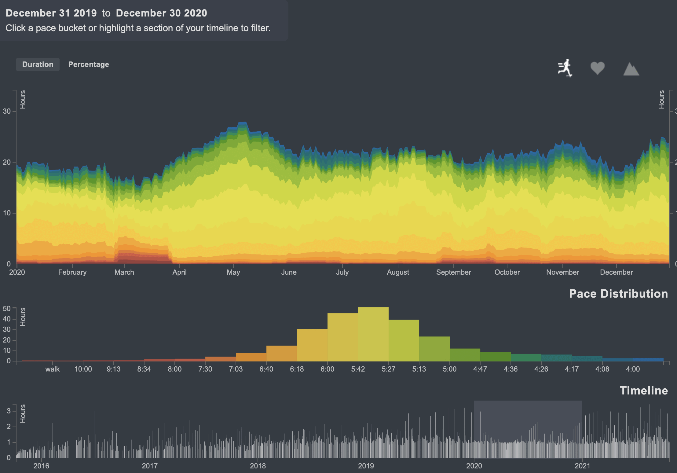 For instance, you can see above that I increased my training load compared to e.g. 2015, but if I want to find out more precisely what my training load has been in say 2020, I can easily zoom in: