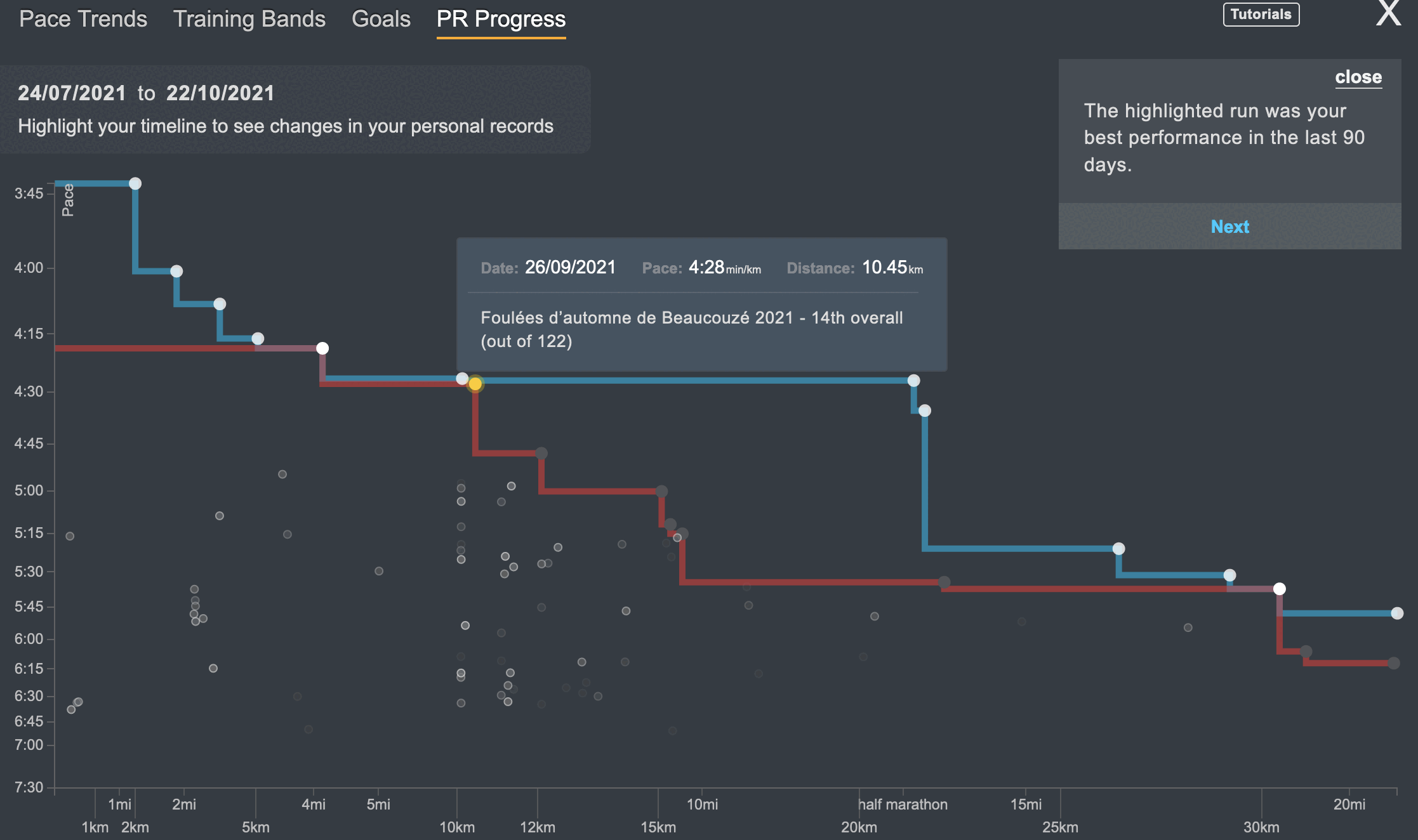the runs I did up to 90 days before this run, with breakdown by distance, pace,