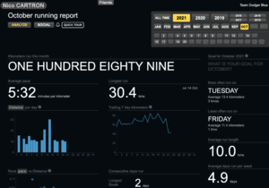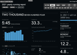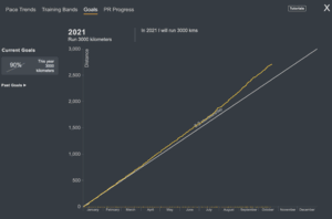 Goals allows you defining a target per month or per year (e.g. "I'll run 200 Kms in November" or "I'll run 2.000 Kms in 2021", and keeping track of those goals: