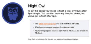You can filter the badges to only display those you don't have yet, and clicking on e.g. the "Night Owl" will show me what it would take me to get it: