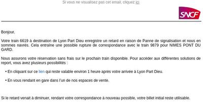 J'étais en train de regarder sur Trainline les options que j'avais, lorsque j'ai reçu un email et un SMS de la SNCF m'indiquant que je risquais de manquer ma correspondance, et que je pouvais changer gratuitement mon billet pour le train suivant, et tout ça en ligne: