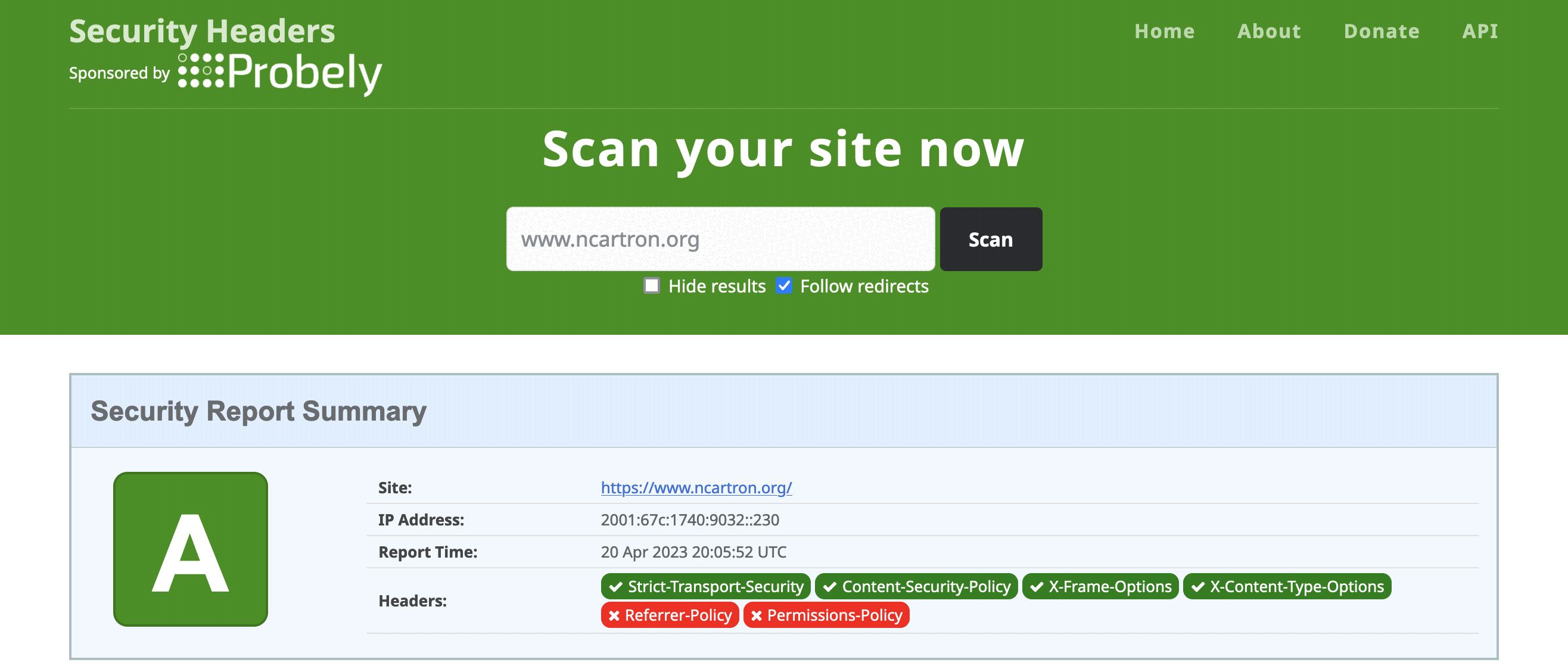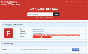 Let's start by testing www.ncartron.org - as you can see, the initial scan was not really great, since I got a F! And indeed, I hadn't implemented any of the security headers.