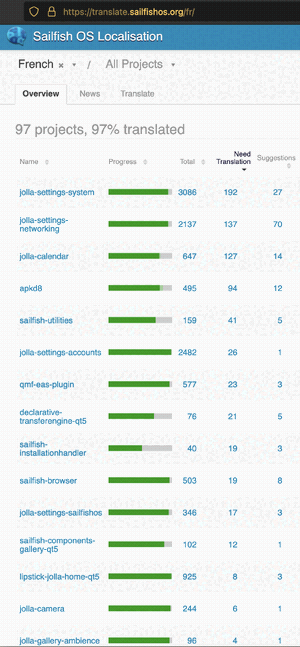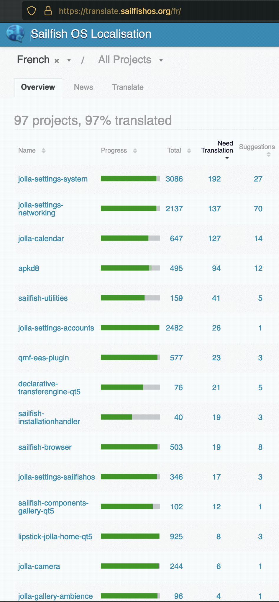 Upon logging on the Sailfish OS localisation website, you'll see a list of languages and projects:
