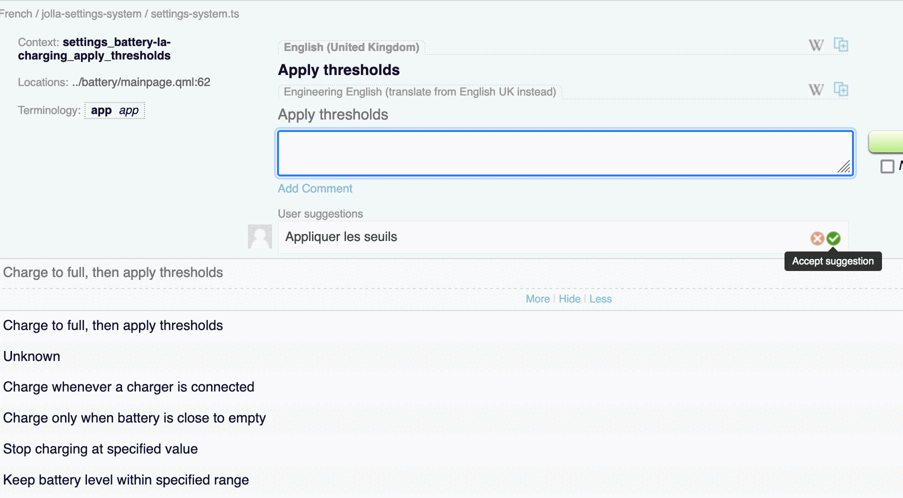 Here is how the translation looks like: for each string, you usually have a context, and a textbox where you can type your translation. Below, if a user has submitted a suggestion, you can review it and accept or reject it: