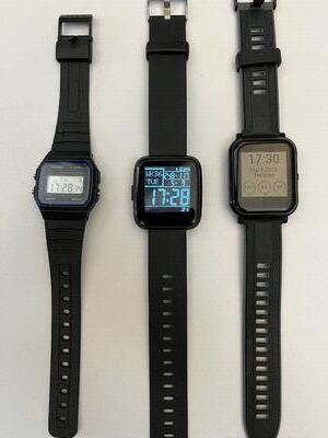 from left to right: Casio F-91W, PineTime, Bangle.js2