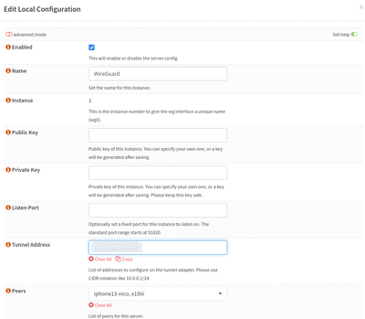- public/private keys are configured from there, and the public key must be pasted in the WG's server configuration